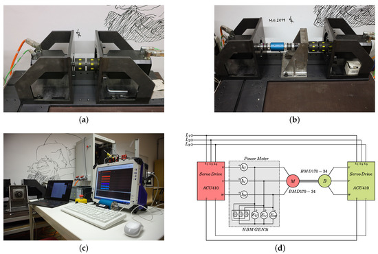 Figure 5. Test-bench of the 1-DOF system available at the Mechanical Lab, Free University of Bozen-Bolzano, Italy: (a) direct coupling of Case (1); (b) coupling of Case (2) with interposition of a planetary gear; (c) HBM GEN3i power meter system; and, (d) schematics of the control and data acquisition system. - Case (2): coupling with the interposition of a Bonfiglioli TQ 070 planetary gear (Figure 5b).