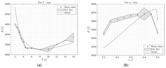 Figure 3 and Figure 4 report the theoretical and experimental results obtained with the trapezoidal and cycloidal trajectories, respectively. For each test, 10 round trips are performed by the manipulator. Dashed lines represent the theoretical curves, whereas shaded areas illustrate mean and standard deviation of the experimental data. Each cross represents the mean value of the 10 complete round trips of the main linear axis of the Cartesian robot through a path of length . Figure 3a and Figure 4a are related to the case of energy minimization with total time T free, which ranges from 0.7 to 2.0 s, and fixed, whereas Figure 3b and Figure 4b consider the case of energy minimization with free, ranging from 0.25 to 0.50 s, and total time T = 1.00 s fixed. The theoretical and experimental minimum-energy solutions for the two different trajectories are reported in Table 2. In the table, the values of consumed energy are calculated as the mean over the 10 tests.