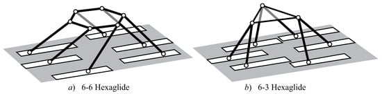 As already mentioned in the previous sections, one of the most suitable kinematic architectures that can meet such desired specifications is the Hexaglide. Six actuated sliders, equally oriented in a given direction of the fixed base, provide the manipulator with a main direction of translation. A typical configuration of the manipulator is obtained with six rigid legs of constant length, and a hexagonal or triangular moving platform according to the connection of the legs in a 6-6 [19] or 6-3 scheme [20] by means of spherical joints, as shown in Figure 1. Six of the twelve spherical joints, the ones at the base or the others at the moving platform, can be replaced by universal joints for a non-under-constrained version of the manipulator, avoiding the spin of the legs about their axis. It is often preferred that there is a reduction of the rails at the frame with three units, where two sliders move in pairs [21,22,23].