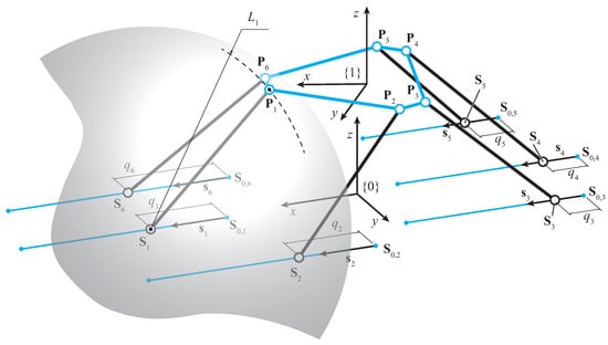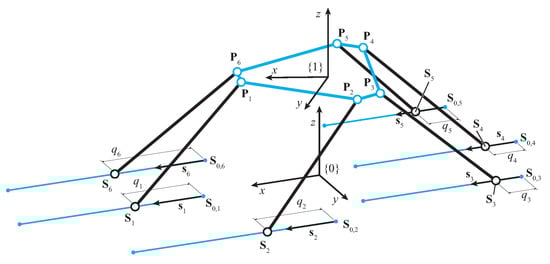 where is the variable position of the attachment point of the ith leg on the frame, corresponding to the ith spherical joint center, driven by the actuated prismatic joints at the base, is the fixed point on each slider that corresponds to when in the home position, is the unit vector giving the direction of the linear sliding, and is the ith actuated joint variable. All the can be gathered in the actuated joint vector . The generality of the expression can be noted, where can still be different for each prismatic joint.