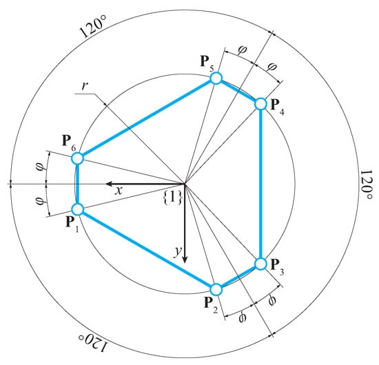 Finally, the moving platform, whose geometric scheme is shown in Figure 3, is parametrized by means of two parameters: r is the radius of a circle, on which the six centers of the upper spherical joints lie, and is the semi-central angle of the circular sector between pairs of points, namely . Such arrangement is motivated by the need to avoid the perfect hexagonal symmetry of singular configurations inside the manipulator workspace, while maintaining a certain symmetry. Matrix in (1) can be used to find the absolute coordinates of each point in the fixed reference frame when the coordinates in the moving reference frame are known: