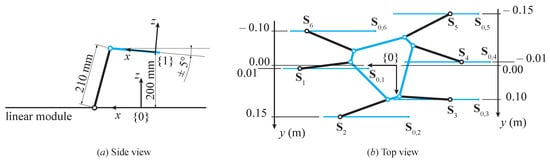 The maximum height of the moving reference frame with respect to the fixed frame is limited to 200 mm, leaving the remaining millimeters to mechanically design the moving platform. According to the results of the kinematic study in Section 3.4, a maximum tilt of for each leg from the horizontal plane is considered in order to be sufficiently far from singular configurations. It follows that a hypothesized length for the legs is 210 mm, as shown in Figure 5a. In addition, the unit vectors of the legs must be as far as possible from being parallel, suggesting a staggered disposition of the linear guides at the base. Their first attempt arrangement is shown in Figure 5b, with a distance of 300 mm between the external guides in order to take into account their physical dimensions.