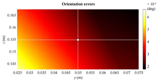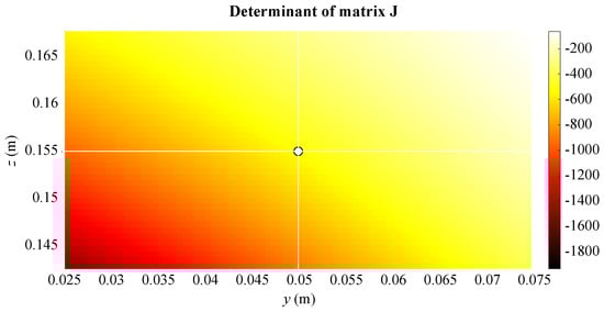 A map of the Cartesian positioning errors obtained by virtue of the nameplate data of the linear stages is shown in Figure 6 on a vertical yz-plane (), covering the manipulator workspace. The white dot represents the Cartesian home configuration of the platform inside its workspace. A fixed orientation is considered in all Cartesian positions, the same as the home configuration, namely , and . The map in Figure 6 is coherent with the one of the determinants of the Jacobian matrix shown in Figure 7, obtained by analyzing the expression in (19) inside the manipulator workspace. In fact, where the value of the determinant is small, the manipulator in the relative Cartesian position is less prone to errors due to uncertainties in the displacement of the linear modules.