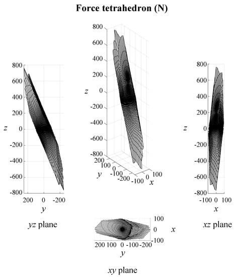 The maximum absolute value of positioning error obtained in the center of the workspace is about 0.6 m. Such value is the worst possible considering every direction and any combination of errors for the actuated carriages, but it significantly reduces according to the direction chosen, even by an order of magnitude. If the first three rows of the Jacobian matrix are considered instead of the second three, orientation errors can be investigated. Figure 8 shows a trend analogous to the other map, where an error in the center of the workspace of about degrees can be read, related to the worst condition. Other studies could be proposed taking into account a change of orientation of the moving platform with a fixed Cartesian position, but results are quite similar to the ones already proposed and do not really add more insight. Finally, a force polyhedron can be evaluated in static conditions to show if the manipulator meets the requirement of a kg payload. Figure 9 refers to the static performance in terms of Cartesian forces in every direction when the manipulator is in its home configuration and no torques are provided at the end effector. The maximum force magnitude is about 800 N, whereas the minimum is about 80 N, but it is easy to verify that the highest performance is related to almost vertical directions, allowing the weight of the mechanical parts of the manipulator to be borne as well as the required payload. Eventually, it can be concluded that the obtained results almost entirely meet the specifications of Section 2.