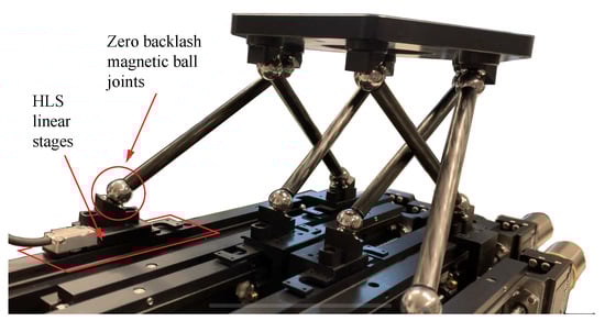 An even more compact design can be obtained with a different leg tilt and similar stages with a shorter stroke of 150 mm, as shown in Figure 10 for a prototype of another confidential version of the Hexaglide by Vacuum Fab Srl. Figure 10 also shows the mechanical solution that can be used for the twelve spherical joints, based on a magnetic principle with self-centering. Preliminary tests on such a prototype have demonstrated a repeatability for linear and angular movements of about m and better than , respectively.