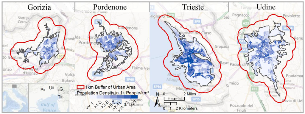 The study areas were the four largest urban environments within the Friuli Venetia Giulia region in Northern Italy: Gorizia (~35,000 inhabitants), Pordenone (~50,000), Trieste (~205,000) and Udine (~100,000). Each city is the capital of one of the four provinces of the same name, thus the study areas have similar administrative functions. The official 2001 administrative data sets were used to, firstly, distinguish urban from non-urban areas, and, secondly, to take into account the spatial distribution of the population density (Figure 1). In order to consider the close periphery as well, we calculated 1km buffers for each of the officially declared urban areas. For simplicity and visibility purposes these buffers were not clipped at national borders (in the case of Gorizia) or at coasts (Trieste as a major seaport of the region combines seaside and landside mobility).