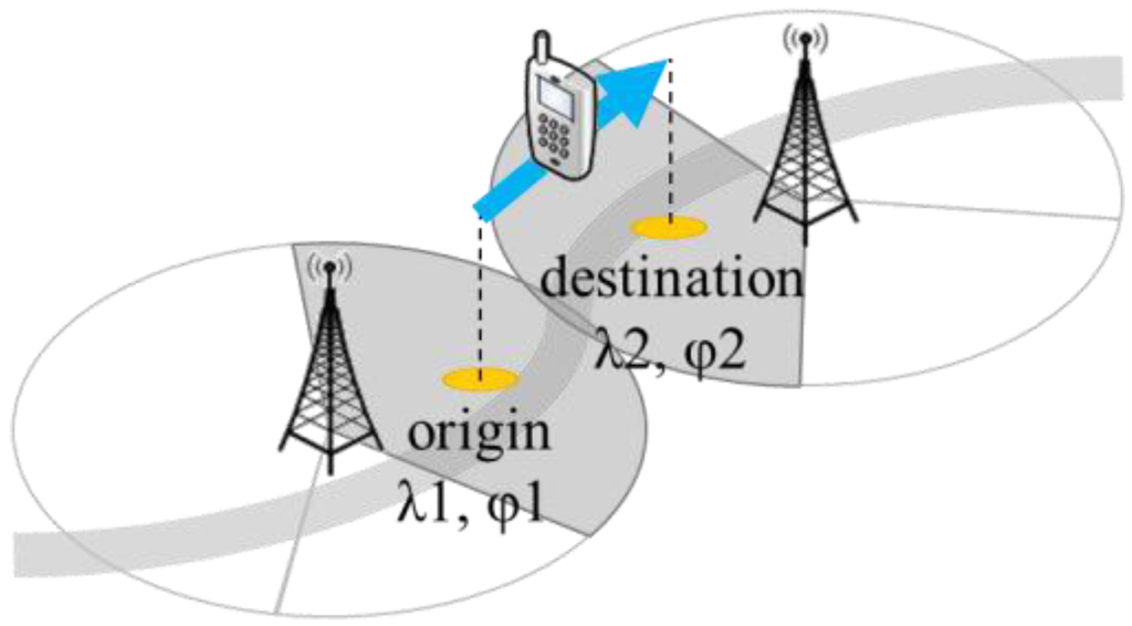 The traffic data were provided as Comma Separated Value (CSV) files for a time series from the 20 July until the 30 September 2009 in 15-min intervals. The data fully covered the four study areas (refer to Figure 1). From the vast volume of mobile telecom data we focused exclusively on the handover, which served as a proxy for the total mobility and the flow of people. A handover is basically the process of transferring an active communication session from one radio cell of the mobile network to another while the mobile device—and thus its user—is on the move (Figure 2). Handovers are managed by the network’s backend.