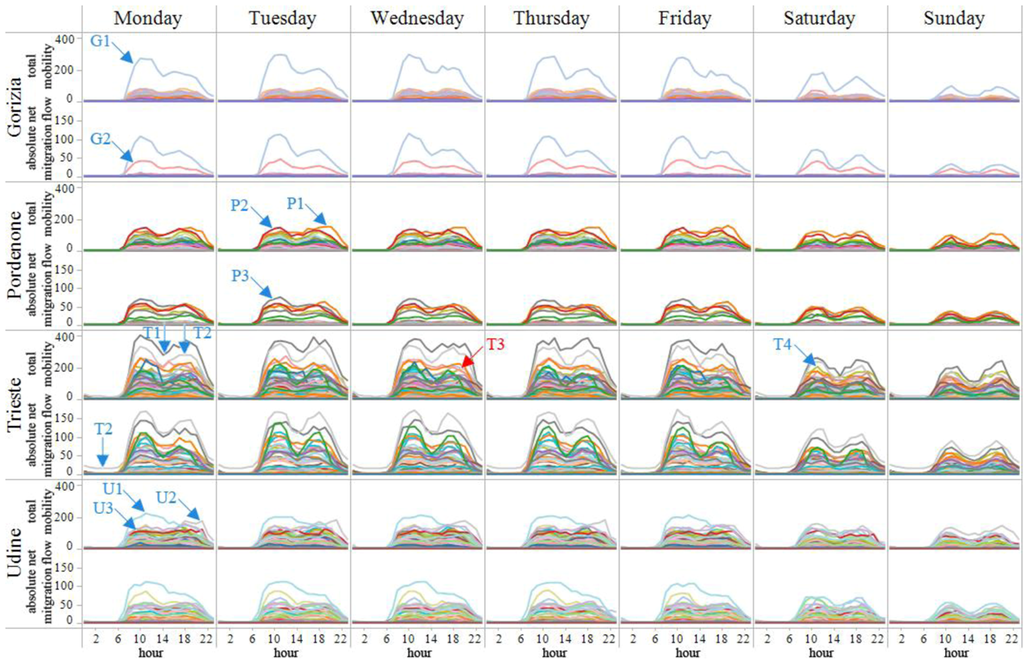 In this paper we visually examined the spatio-temporal patterns of collective human mobility derived from user-generated mobile network traffic data. In order to answer the research question we developed a four-step analysis approach, from raw data processing to urban mobility information visualization, and searched for characteristic and exceptional mobility behavior. Based on the example of Gorizia, Pordenone, Trieste, and Udine we extracted characteristic mobility patterns and compared them among the four test areas. We showed the characteristic spatio-temporal configuration of the mobility gateways, and mobility hot-spots in terms of total mobility and absolute net migration flows. As a matter of fact, we revealed surprising similarities and symmetries of the mobility among the urban test areas. This seems to be a logical conclusion from ([], p. 7205), namely “[…] that cities are self-similar organizations, indicating a universality of human social dynamics […]”. Furthermore, we detected several exceptional mobility patterns that could be associated to specific real-word events. The spatio-temporal mobility pattern of this concert is similar to the pattern of the Madonna concert [], but they can hardly be directly compared on a purely visual basis.