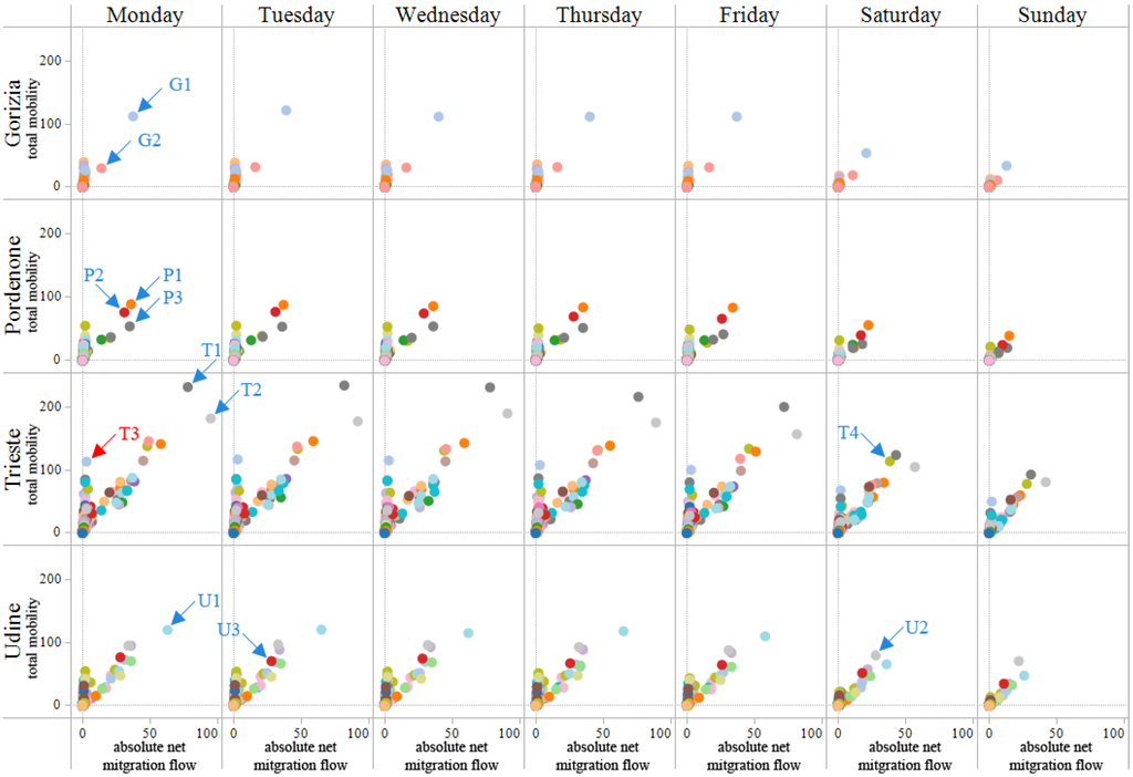 In Gorizia, the particularly high mobility at one cell-link (Figure 4: G1), and the second highest cell-link of net migration flow (Figure 4: G2) indicate two mobility gateways. These two gateways are confirmed by Figure 5. However, they are considerably more active during weekdays as compared to in the weekend, in particular Sundays. The other cell-links remain almost balanced, i.e., they are located very close to the y-axis in Figure 5.