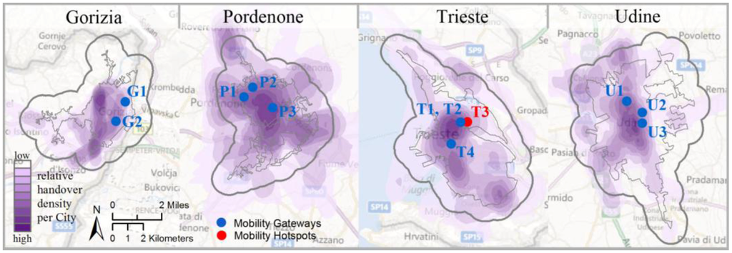 Figure 6 shows the spatial distribution of mobility gateways and mobility hotspots, as well as the spatial density estimation of the total mobility for each urban environment. For Gorizia and Trieste, since both are located right at the border to Slovenia, Figure 6 highlights only the mobility gateways as seen by the Italian mobile network. To compare the mobility hotspots and mobility gateways spatially among the four environments, they are represented as points but are in fact lines.