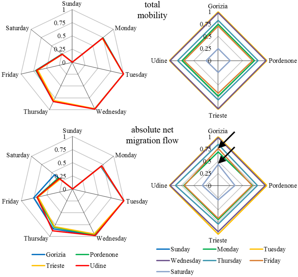 To allow for a better comparison of both similarity and symmetry the total mobility and the absolute net migration flow have been normalized between 0 (=minimum) and 1 (=maximum) for each area separately. All patterns show that the maximal total mobility is reached on Tuesday, closely followed by Wednesday; the minimal total mobility is clearly on Sunday. However, the absolute net migration flows (Figure 7, bottom) start to diverge on Wednesday and converge again on Sunday (Figure 7, bottom left). In fact, the smallest city—Gorizia—shows the comparably highest mobility activity on Friday and Saturday, which is confirmed as an asymmetric mobility behavior in Figure 7 (bottom right, indicated with two arrows).