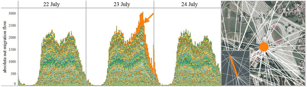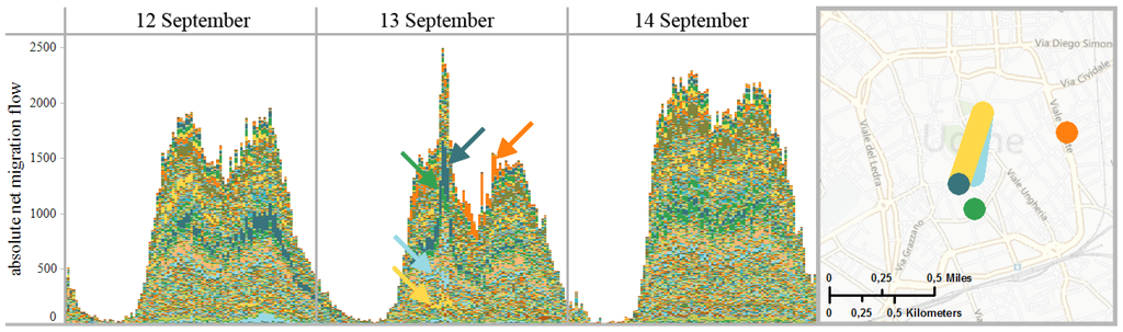 Figure 10 shows how a “moving event”, in this case a parade, is reflected in the absolute net migration flow. The pattern on the 13 September 2009 shows five cell-links with comparably high flows at different time intervals and different locations, thus indicating a collective movement. This spatio-temporal pattern correlates with the program of the parade [].