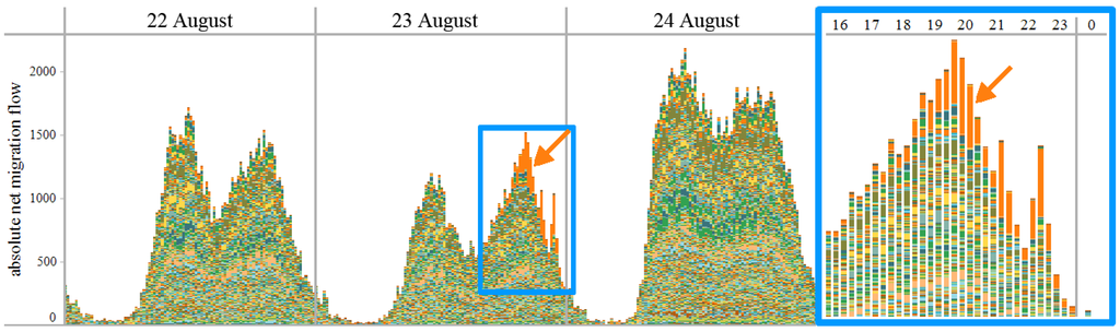 Figure 9 shows an outstanding cell-link in the evening hours of the 23 August—it is the same cell-link as highlighted in Figure 8. In this case the temporal pattern of that cell-link is visually somewhat different from the previous example as there are three distinguishable peaks and two dips. The detailed view of these evening hours (Figure 9 right side) reveals some specific characteristics: the absolute net migration flow at this cell-link rises before it decreases for three time slices, increases again for one 15-min step, decreases again for three time intervals before the activity of that cell-link “disappears” in the background pattern.