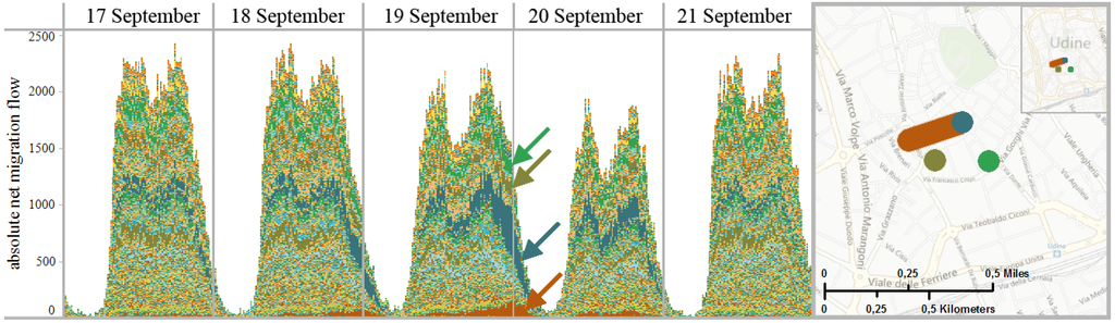 The spatial and temporal coincidence of outliers in the absolute net migration flow, as shown in Figure 11, allows for reasoning about the functional configuration of the affected area (e.g., a popular bar for socializing, some difficulties at a specific road intersection, etc.).