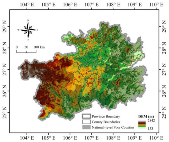 As an objective social phenomenon, poverty has accompanied the vicissitudes of human society, which is a chronic dilemma hindering human civilization [1]. China, the world’s largest developing country, has been undergoing rapid economic development [2]. In the past years, China has taken a large number of comprehensive poverty-alleviation work and has achieved remarkable success in poverty reduction since the beginning of the economic reforms [3]. China was therefore the first country in the world to successfully achieve the target of Millennium Development Goals of having extreme poverty in 2012, which was ahead of schedule [4]. However, there are still a large number of poor people, and, at the same time, new aspects of poverty have emerged in China. Poverty remains a serious issue for China’s modernization [5]. In Southwest China, the high altitude and mountainous terrain lead to the low efficiency of land use and the underdeveloped transportation, which are the important causes of poverty [6]. Guizhou, a relatively poor province in Southwest China, has more mountainous areas, less flat land, and backward economic development [7]. Coordinating regional development, reducing poverty, and preventing the reoccurrence of poverty are the major challenges of its social and economic development [8].