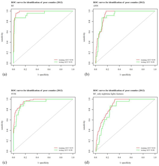 The Receiver Operating Characteristic (ROC) curves of poor counties identification in 2012. (a) ROC curves of poor counties identification by RF, (b) ROC curves of poor counties identification by ANN, (c) ROC curves of poor counties identifi-cation by SVM, (d) ROC curves of poor counties identifi-cation by RF_only nighttime lights fea-tures.