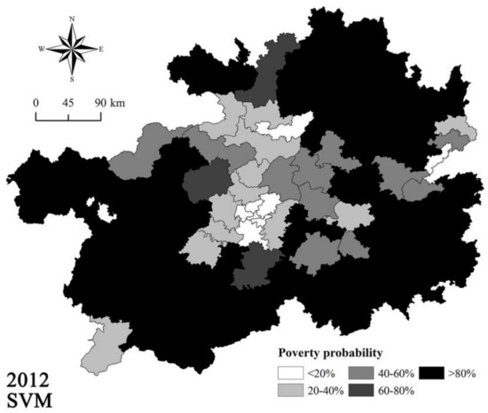 Distribution of poverty probability at the county level by Support Vector Machines (SVM) in 2012.