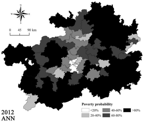 Distribution of poverty probability at the county level by the Artificial Neural Network (ANN) in 2012.