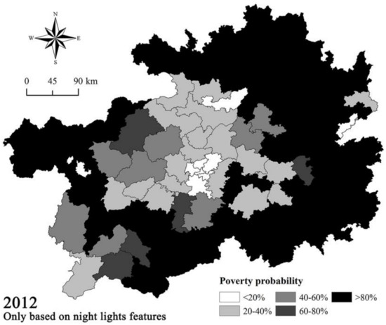 The classification result was denoted by the median value of probability, which can reveal the poverty level of each county and reflect the characteristics of relative poverty. Specifically, the closer the probability value is to 1, the greater the probability of the county to be a poor county. To a certain extent, the choice of threshold will have a significant impact on the accuracy and the prediction error of the model. We set the counties with poverty probability over 0.8 as poor counties. Accuracy is assessed by calculating the coincidence rate in space between the identification results and the 2012 government designation. On the premise that better identification results can be obtained for 2012, we used the RF model derived for 2012 to predict poverty probability at the county level of all the nighttime light imagery from 2012 to 2019 and to investigate the relative spatiotemporal patterns of poor counties in Guizhou.