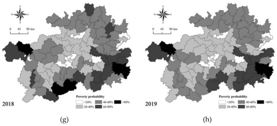 In order to study the dynamic changes in the poverty-alleviation phases of Guizhou and the impact of the phased policies on the distribution of poor counties, we further analyzed the poor counties at some important phases. In the year of 2016, China over fulfilled the goal of reducing rural poverty by 10 million with the support of national policies, which was a milestone in the history of poverty alleviation in China. Figure 6 shows the number of counties with a poverty probability greater than 80% decrease significantly in 2016, reflecting the poverty-alleviation achievements. The Chinese government pointed out that 2019 was a crucial year to win the fight against poverty. As shown in Figure 6, the poverty probability in Guizhou is greatly reduced in 2019, and there are only three counties with a poverty probability greater than 80%. These findings reveal that the regional economic development and national policy implementation are highly related to the spatiotemporal dynamics of poverty, and the key to achieving regional poverty reduction is the development of the regional economy and the implementation of national macrolevel policies. Therefore, the results of the spatiotemporal dynamic of poverty can be used to make targeted policies for poverty reduction in impoverished areas, to achieve more sustainable and effective poverty-alleviation.