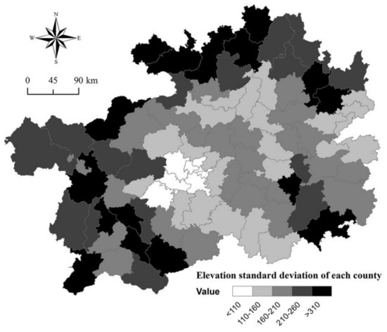 The distribution of poor counties in Guizhou is contiguous, and the spatiotemporal characteristics of contiguous poverty-stricken areas from 2012 to 2019 are evident in Guizhou. The changes in the boundaries of impoverished areas indicate that the spatial distribution of impoverished areas has become more complex, showing obvious regional characteristics. We extracted the spatial distribution characteristics of the topography at the county level (Figure 7 and Figure 8). It is found that the boundary change in the poverty-stricken areas is highly related to the terrain features, and that poverty-alleviation is easier to implement in areas with a high proportion of plains. The plain area in central Guizhou has the lowest incidence of poverty. The area with high altitude and high topographic relief usually has a high incidence of poverty. In addition, the internal fragmentation of the contiguous poverty-stricken areas is intensifying.