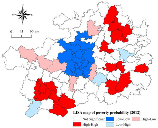 Figure 10 shows the local autocorrelation of poverty probability at the county level in 2012. As shown in the figure, the high-high clusters are primarily located in the eastern and southwestern regions of Guizhou. The central part is identified as having low-low clusters. These results indicate that relatively poor and non-poor counties have obvious regional distribution features. The high-low distribution is mainly found around the low-low clusters, which is related to the rapid poverty-alleviation in this area. The low-high areas were scattered, which were the areas with high possibility of returning to poverty and were also the key areas of poverty-alleviation.