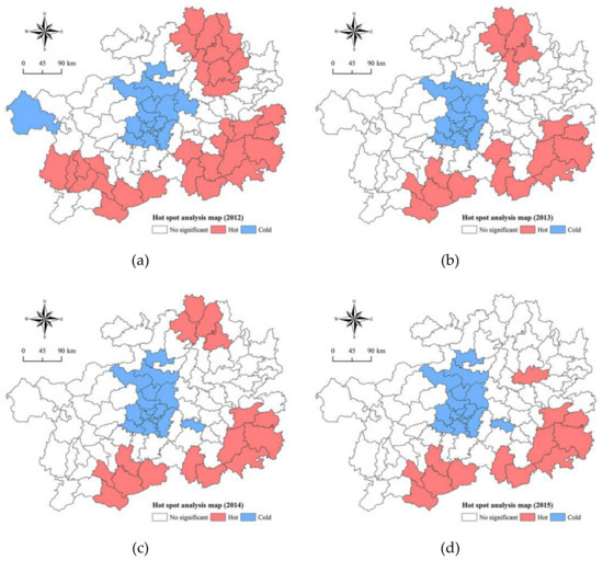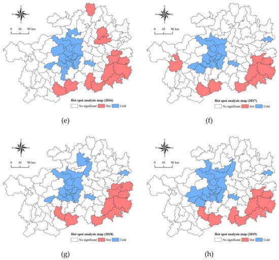 Hot-cold spot map of poverty probability at the county level; (a) hot-cold spot analysis map of poverty probability at the county level in 2012, (b) hot-cold spot analysis map of poverty probability at the county level in 2013, (c) hot-cold spot analysis map of poverty probability at the county level in 2014, (d) hot-cold spot analysis map of poverty probability at the county level in 2015, (e) hot-cold spot analysis map of poverty probability at the county level in 2016, (f) hot-cold spot analysis map of poverty probability at the county level in 2017, (g) hot-cold spot analysis map of poverty probability at the county level in 2018, (h) hot-cold spot analysis map of poverty probability at the county level in 2019.