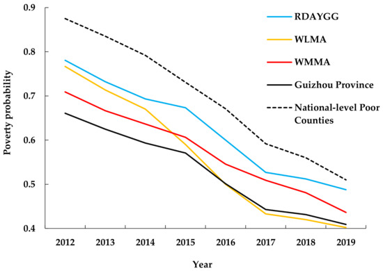 There are three national contiguous poverty-stricken areas (Figure 12) that located in Guizhou partly. They are Wuling Mountain Area (WLMA), Wumeng Mountain Area (WMMA), and Rocky Desertification Area in Yunnan, Guizhou, and Guangxi (RDAYGG). Figure 13 shows the average poverty probability of counties at various regional scales since 2012. The average value of national-level poor counties in Guizhou is greater than that of the WLMA, WMMA, RDAYGG, and the whole province; the average poverty probability of national-level poor counties has approximated that of the whole province; the average value of national-level poor counties is falling faster than that of the whole province. The average value of RDAYGG is far greater than that of the whole province. Since 2016, the average poverty probability of the WLMA has been less than that of the whole province. It indicates the effect of poverty reduction has been remarkable in the region.