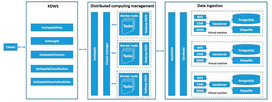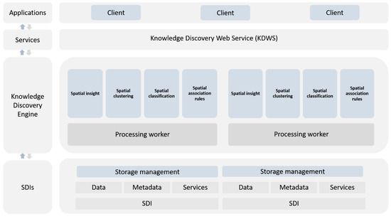 Figure 2 presents the general architecture of the proposed solution. The architecture contains four major layers to provide desirable functionalities and capabilities: (1) the SDI layer is responsible for the integration of distributed and heterogeneous data from different SDIs, using modern big data storage technologies; (2) a knowledge discovery engine layer supports high-performance spatial data mining techniques across clusters of computers named processing workers; (3,4) seamless and interoperable interaction between clients and bottom layers provided by the KDWS. In the following sections, a detailed description of the architecture components is described.