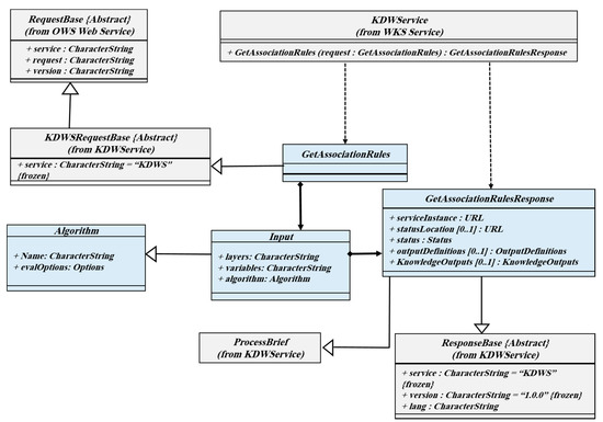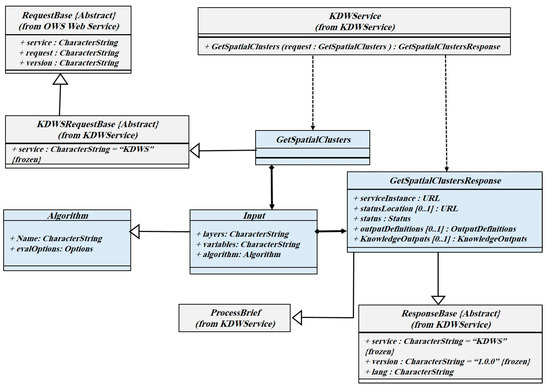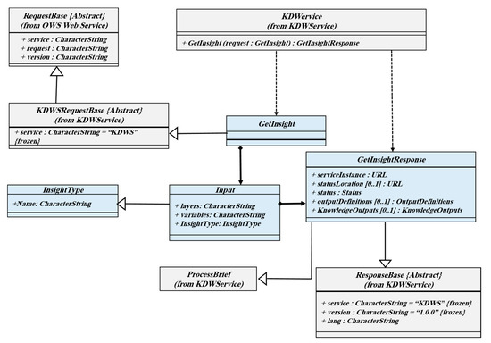 The class diagram shows that KDWS inherits GetCapabilities operation from the OWS interface and adds three operations named GetInsight, GetSpatialClusters, GetSpatialClassification, and GetSpatialAssociationRules. It should be noted that OGC /ISO standards related to UML notation have been used to define interface specifications of KDWS. Given the wide variety of SDM techniques, it is very difficult, if not impossible, to create a single schema that can provide different structures and parameters as an interface. Therefore, each data mining algorithm is defined as a separate interface. Although the proposed service operations are different from other OGC services, such as Web Processing Service (WPS), Web Coverage Service (WCS), and WFS, there are many similarities with common interfaces. Therefore, since OWSs use a standard called Common Implementation Specification in shared implementations, this specification is used in this study [