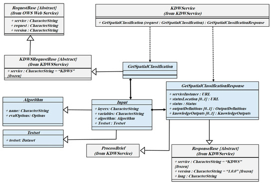Implementing spatial classification algorithms in the form of web services is more complex than other SDM algorithms. The reason should be founded in the separate training and testing steps. To handle this complexity in the KDWS service interface, it is possible to consider a part of the data set for testing and learning of the model. For example, 20 percent of the dataset can be randomly considered as test data, and the model can be calculated after the execution of the algorithm. The number of mandatory and optional parameters varies depending on the algorithm used. Unsupervised algorithms in the GetSpatialClassification operation are also supported. The GetSpatialClassification operation class diagram is depicted in