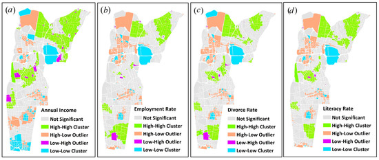 Figure 12, homogeneous statistical blocks of the study area based on different variables including income, employment, divorce rate, and literacy rate were identified as different spatial clusters. In the figure, green and blue regions are clusters as well as red, and purple is the outliers.