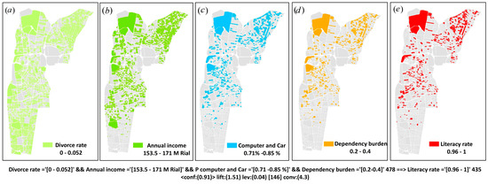 In the first rule, if the literacy rate is more than 96%, 71–85% of households have a computer and personal car, the family size is between 2.9 and 3.5, and the dependency burden is between 0.2–0.4, then the average annual income of households living in these blocks will be between 153 and 171 million Iranian Rials. The support and confidence values for this rule were 0.125 and 0.94, respectively.