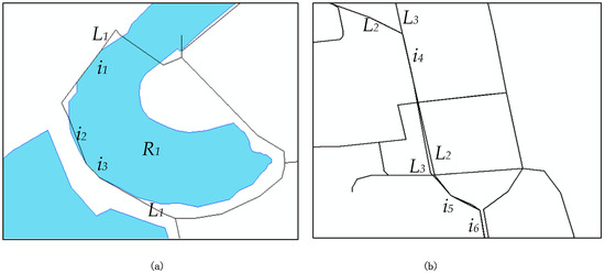 According to the attribute table of the INSECTLINE layer and INSECTPOINT layer, the types of each intersection component and the traffic and water region object involved can be queried. Figure 18a shows a partial amplification drawing of the test region, where water region R1 has multiple intersecting-lines with traffic lines (L1, L2, and L3), and Figure 18b shows the satellite image of the corresponding area. The class (type) of intersection-line between region R1 and line L1 is D (Figure 18c), which corresponds to type <1, 4Out> in Figure 9d; The class of intersection-line between region R1 and line L2 is S (Figure 18d), and its type corresponds to <4Out, 4Out> in Figure 9s. The classes of intersection-lines between region R1 and line L3 is I (Figure 18e), P (Figure 18f), and J (Figure 18g), and their corresponding types are <3Out, 3Out> (Figure 9k), <3On, 4Out> (Figure 9p), and <3In, 3Out > (Figure 9j), respectively.