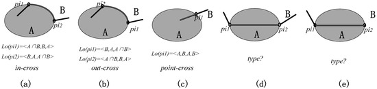 For the line/region at a refined level, the LRBIS (intersections set between line and region boundary) method proposed by Deng [16] is representative at present. In this method, the line-region relations are classified into 16 types of basic relations (including 1 disjoint and 15 non-disjoint relations) based on the invariants of dimension and local order, and the compound relations are decomposed into and described by a combination of a finite number of basic intersection relations. However, the definition of the intersection component in this method is not based on the whole line and whole region intersection but is based on the intersection between the whole line and the boundary of the region. Therefore, its intersection components do not follow people’s cognitive habits well, and some actual types of one-dimensional intersections between the line and region interior are omitted. For example, this method defines only three cross types (see Figure 2a–c), while the other cross types that exist (Figure 2d,e) are not defined. In other words, the LRBIS method is incomplete.