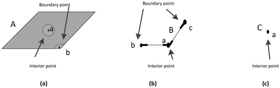 Notably, a manifold itself is a topological space (local Euclidean space), so its neighborhood is only related to itself and is independent of the Euclidean space in which it is embedded, meaning that the definitions of the interior and boundary points in a manifold are also independent of the space in which the manifold is embedded (see Definition 2.1), which is different from the definitions using the point-set topology in Euclidean space. As shown in Figure 3, the region (Figure 3a), the line (Figure 3b), and the point (Figure 3c) all have interior points in R2, which is consistent with traditional definitions and cognitive habits. In addition, because a manifold is a special topological space, it also has some of its topological properties, such as whether it is compact, connected, orientable, etc. Further, manifolds are not self-intersecting or touching and homogeneous (same dimension). According to the geometric characteristics of common objects in the spatial database, the (simple) spatial objects in 2D space are defined as follows in this paper.