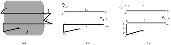 As shown in Figure 4b, the intersection set of region A and line B has four maximal connected subsets (topological components), namely, L1 (p1p2p3p4), L2 (p6p7), P1 (p5), and P2 (p8). Among them, P1 and P2 are zero-dimensional intersections because they are both simply isolated points, so they do not need to be subdivided. L1 and L2 are one-dimensional intersections, where L2 does not need to be subdivided because its interior points are all in the interior of region A, whereas L1 is relatively complex, and its interior points do not have the same topological property in region A. For example, points between line segments l1 (p1p2) and l3(p3p3) are inside A, while points between line segments l2(p2p3) are on the boundary of region A. Therefore, even though intersection-line L1 is connected, it is more reasonable to break at points p1 and p2, which is also more in line with people’s cognitive habits. Furthermore, if we assume that region A is a lake, line B is a road shaped by the volunteer’s trajectory. Then, l1 (p1p2) may be a trail extending in the lake or a wrong trajectory segment, l2 (p2p3) maybe a road along the lake, and l3 (p3p3) may be a bridge across the lake. Therefore, in practical applications, the intersection-line L1 also needs to be subdivided.