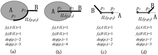Although the framework of the E-WWIS model is also suitable for describing line/region and line/line refined relations with multi-intersections, some refined one-dimensional intersection (intersection-line) types of line/region and line/line cannot be distinguished by relying solely on the “Euler number”. For example, let “IL” denote intersection-line l; in Figure 5, region (or line) A intersects line B at segment l (p1p2). In Figure 5a,b, the values of fE (A\IL) and fE (B\IL) are the same. However, the topological types of the two intersecting lines are different, in Figure 5a, the intersection-line l is completely on the boundary of region A, and in Figure 5b intersection-line l is inside region A. Similarly, the intersection-line types between two lines in Figure 5c,d are different, but their values of fE (A\IL) and fE (B\IL) are the same.