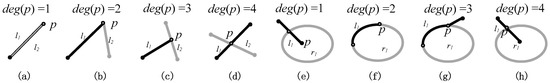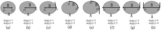 Figure 7. Intersection-line types of line/region that can be distinguished by node degree. (a) Case of degree-pair (1,1); (b) Case of degree-pair (1,3); (c) Case of degree-pair (1,4); (d) Case of degree-pair (2,2); (e) Case of degree-pair (2,3); (f) Case of degree-pair (3,3); (g) Case of degree-pair (3,4); (h) Case of degree-pair (4,4).