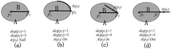 Figure 8. Examples of the intersection-lines that cannot be distinguished by only node degree but can be distinguished by the combination of node degree and adjacent point kinds. (a) Case of degree-pair (1,3) and the adjacent point kind of p2 is Null; (b) Case of degree-pair (1,3) and the adjacent point kind of p2 is On; (c) Case of degree-pair (1,4) and the adjacent point kind of p2 is In; (d) Case of degree-pair (1,4) and the adjacent point kind of p2 is Out.