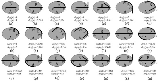 By combining the degree of nodes (1,2,3,4) and the adjacent point kinds (Null, On, In, and Out), our model can distinguish the different 256 (4 × 4 × 4 × 4) types of intersection-lines between line/regions in theory. However, only a few of them (possible types) actually exist in R2. Since the node degree values of the intersection-line endpoints only exist a total of 16 combined values (only 10 asymmetric), the possible types can be searched one by one based on these combined values and their corresponding possible adjacent point kinds. In fact, 21 types of possible and asymmetric intersection-lines are classified and found by using this method, as shown in Figure 9. It should be noted that the node degree has a higher priority than the adjacent point kinds, so the description of adjacent point kinds is sometimes ignored when it is not necessary.