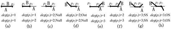 Figure 10. Eight types of possible and asymmetric intersection-lines between lines. (a) Case of degree-pair (1,1); (b) Case of degree-pair (1,2); (c) Case of degree-pair (2,2) with Null adjacent point kind; (d) Case of degree-pair (2,2) with Null and Out adjacent point kind; (e) Case of degree-pair (1,3); (f) Case of degree-pair (2,3); (g) Case of degree-pair (3,3) with SS comprehensive adjacent point kind; (h) Case of degree-pair (3,3) with OS comprehensive adjacent point kind.