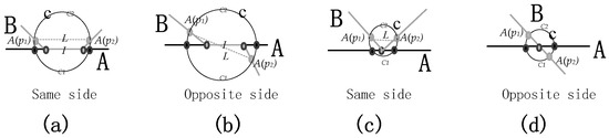 “Definition 3.2” (Same and opposite sides): Let I be an intersection component between lines A and B, points A(p1) and A(p2) be the two adjacent points of L, and c be a circle made with straight-line L(A(p1) A(p2)) as the diameter. Circle c can be divided into two different arcs c1 and c2 by line A. If points A(p1) and A(p2) are on the same arc, then they are on the same side as line A, and the comprehensive type of these two adjacent points is named the same side (SS). If points A(p1) and A(p2) are on different arcs, then they are on the opposite side of line A, and the comprehensive type of these two adjacent points is named the opposite side (OS).