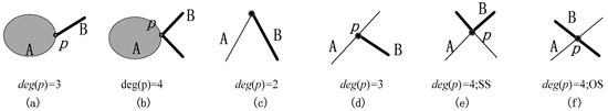 Because the node degree of the intersection-point of line/region can be only three or four in R2, there are only two possible types, which can be distinguished by using only node degrees. They are shown in Figure 12a,b. The node degree of the intersection-point of line/line can be two, three, or four in R2. For the node degree of two or three, there is only one possible type of the line/line intersection-point, as shown in Figure 12c,d. For the node degree of four, its possible types of the line/line intersection-point need the comprehensive kinds of adjacent points to distinguish them. As shown in Figure 12e,f, the comprehensive kinds of the two adjacent points of the intersection-point are SS and OS, respectively. Finally, by combining the node degrees and adjacent point kinds, six types of possible and asymmetric intersection-points of line/region and line/line are classified, as shown in Figure 12.