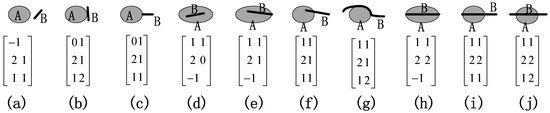 For the line/region relations, although the E-WID model is coarse, it can discriminate an infinite number of coarse relations because a line and a region can have an infinite number of intersection components (or difference components), and the value of fE can reflect the differences between them. In this paper, only the relations with a single intersection (or disjoint relation) that can be distinguished by the E-WID model are illustrated, as shown in Figure 13. Among them, Figure 13a is disjoint, and Figure 13b,c both have only one zero-dimensional intersection, but one is inside of line B and the other is on the boundary of line B; Figure 13d–j all have only one one-dimensional intersection. The topological configurations in Figure 13d–j are as follows: Line B is contained by region A (Figure 13d), B is covered by A but only one endpoint is on the boundary of A (Figure 13e), B overlaps with A but has no endpoint on the boundary of A (Figure 13f), the one-dimensional intersection is on the boundary of A (Figure 13g), B is covered by A and its endpoints are both on the boundary of A (Figure 13h), B overlaps with A and has one endpoint on the boundary of A (Figure 13i), and B crosses A (Figure 13j). It is worth noting that some elements of the matrix in Figure 13 are ignored when they are empty (there are no corresponding spatial components), and this expression follows that of Zhou et al. (2013). The specific reason is that it can show the difference between them and elements whose intersection is not empty but whose Euler number is zero.