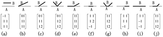 Similarly, the E-WID model can also discriminate an infinite number of line/line coarse relations. Figure 14 shows the line/line coarse relations with a single intersection distinguished by the E-WID model. Among them, Figure 14a is disjoint, Figure 14b–d all have only one 0-dimensional intersection, and Figure 13e–j all have only one one-dimensional intersection.