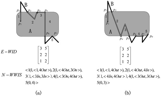 Figure 15 shows two line/region relations with multiple intersection components. Although they both contain four intersection-lines and one intersection-point in Figure 5a,b, the dimension, sequence, and topological types of each component are not all the same. These two refined relations with different topological configurations are indistinguishable by the coarse model (E-WID), and the refined model (N-WWIS) must be used. The result of the N-WWIS description in Figure 15 reflects the difference between them. For example, the description result of the intersection component with sequence 2 is 2 (1, <4Out, 3On>) in Figure 15a. Where the number outside the bracket indicates its sequence number (i.e., two), the first number in the bracket indicates the dimension (i.e., 1-dimensional), and the expression <4Out, 3On> in the rest bracket indicates its topological type, which corresponds to the symmetrical type in Figure 9p. The description result of the intersection component with sequence 2 is 2 (1, 4Out, 4In) in Figure 15b, where the dimension is 1 (intersection-line) and the topological type is <4Out, 4In> (i.e., the symmetrical type in Figure 9t).