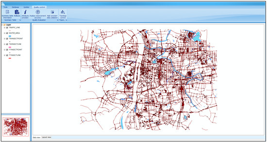 The prototype system was intensively tested using the OpenStreetMap (OSM) data of Changsha city, Hunan Province, China, as experimental data (July 2019, as shown in Figure 17). The area of the test region is 1938 km2, including 8688 traffic lines and 277 water regions, which correspond to the TRAFFIC LINE layer and WATER-AREA layer in Figure 17, respectively. Since the number of real conflicts in OSM data is unknown, 19 additional traffic lines, which have conflicting relations with water-area, are simulated to evaluate the N-WWIS model. In addition, to highlight the results of topological conflict detection, we place the relevant intersection components on the temporary work layers. For example, the intersection-lines and intersection-points between the traffic line and water region are placed in the TWINSECTLINE layer and the TWINSECTPOINT layer, respectively.