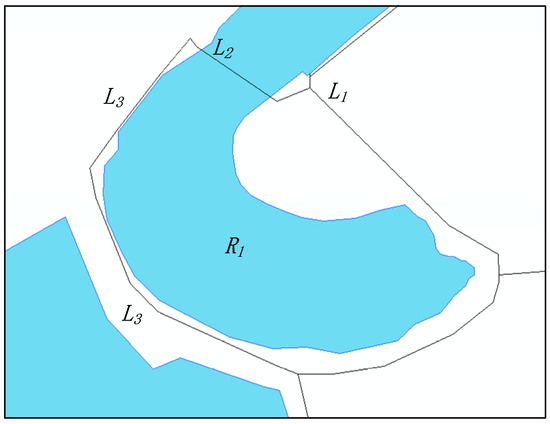 Referring to the actual situation (satellite images), the potential topological conflicts of lines/regions in Figure 18 are addressed as follows: in Figure 18c, the part (intersection-line) of the traffic line L1 that falls into the water region R1 needs to be cut out; in Figure 18b, the involved data do not need to be modified because the intersection-line is usually a bridge; in Figure 18d, the position of line L3 at the intersection needs to move to a certain position away from region R1; in Figure 18e, the part of line L3 at the intersection-line may need to be modified to keep it from falling into the lake; finally, in Figure 18f, the direction of line L3 at the intersection-line needs to be adjusted so that it is not tangent to region R1. Similarly, other types of topological conflict dealing rules are established in our system based on the topological types of intersection components and the actual situation. According to the rule set we established, the corresponding conflict addressing results in Figure 18a are shown in Figure 19.