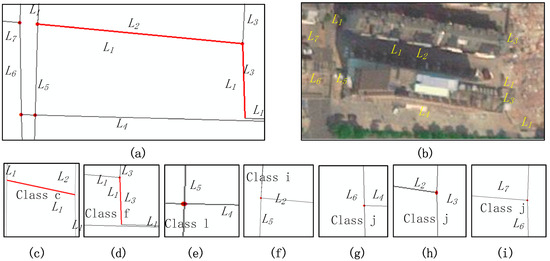 Figure 20a shows the line/line intersection component of the local area in the test data, and Figure 20b shows the satellite image of the corresponding area. Among them, there are one intersection-line of class c (Figure 20c), one intersection-line of class f (Figure 20d), one intersection-point of class l (Figure 20e), one intersection-point of class i (Figure 20f), and three intersection-points of class j (Figure 20g–i).